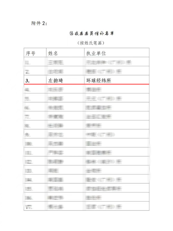荣誉|环球经纬左韵琦、苏漫那律师分别入选广州市律师协会惩戒委、调查委委员发表时间:2025-10-17 10:10 近日,经广州市律师协会十一届六十三次会长会议审议通过,我所左韵琦律师入选惩戒工作委员会委员,苏漫那律师入选调查工作委员会委员。